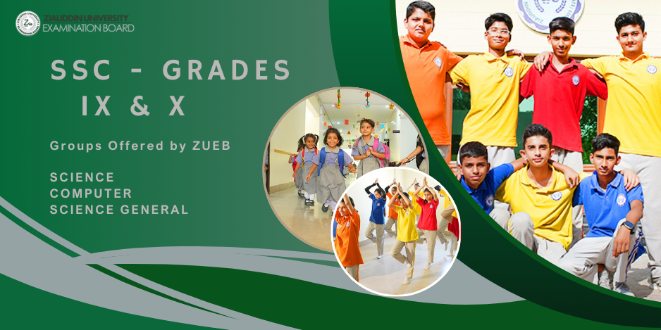 The Secondary School Certificate (SSC) programme at Ziauddin University Examination Board (ZUEB) spans two years, covering Grade IX (SSC I) and Grade X (SSC II). Students may choose one of three groups according to their interests: Science Group – for students interested in Physics, Chemistry, Biology, and Mathematics. Computer Science Group – for students who want to learn Computer Science along with Physics, Chemistry, and Mathematics. General Group – for students who prefer subjects like General Science, General Mathematics, Economics, Education, Islamic Studies or Civics. Each group has: Compulsory subjects: English, Urdu, Pakistan Studies, Islamiyat and Religious Studies. Elective subjects: Specific to the chosen group. Students complete exams for all subjects over the two years, ensuring a balanced curriculum that strengthens academic knowledge, develops analytical skills, and prepares learners for higher education and future career paths.